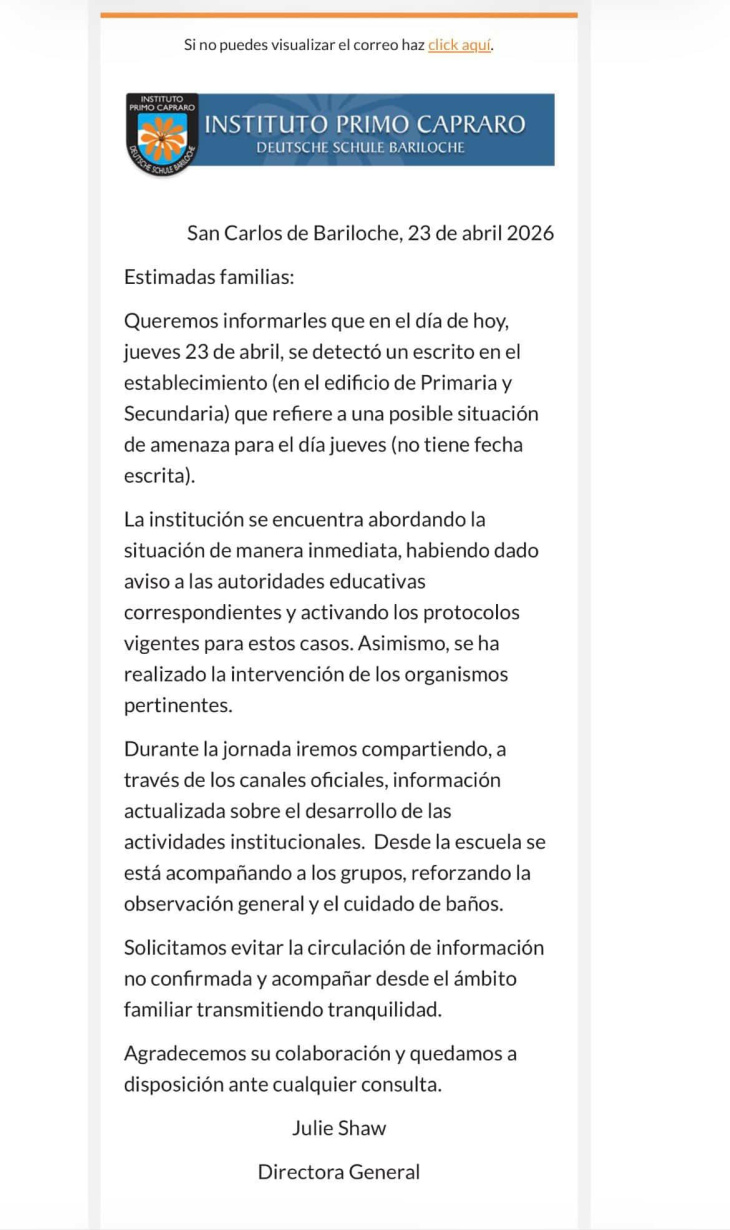 En el Instituto Primo Capraro, la situación fue similar. Según informó la directora general Julie Shaw a las familias, se detectó un escrito en los edificios de Primaria y Secundaria que refería a una posible amenaza para un día jueves, aunque sin fecha escrita. La institución dio aviso a las autoridades educativas, activó los protocolos vigentes e intervino los organismos pertinentes. Durante la jornada, el establecimiento reforzó la observación general y el cuidado de los baños, acompañando a los grupos en todo momento.